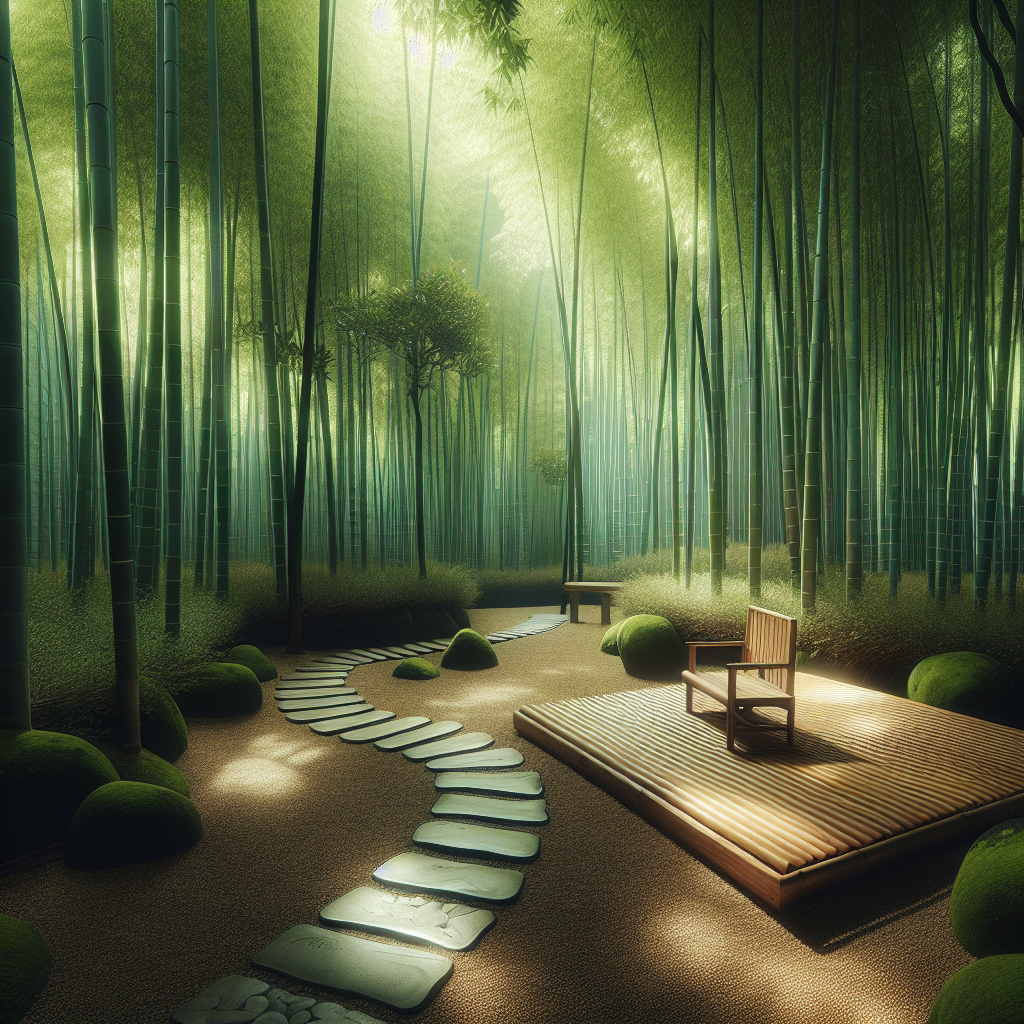 Step into a serene bamboo forest with soft dappled sunlight filtering through lush green leaves. A minimalistic wooden bench invites quiet reflection amidst the gentle rustling of bamboo stalks swaying in the breeze. The air is filled with a sense of calm, as delicate stones line a winding path that leads deeper into nature’s embrace.
